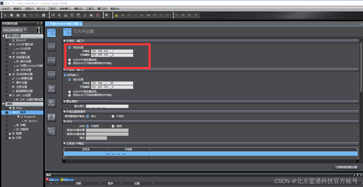 测试用PLC为欧姆龙NX102-1100 ,设置PLC IP地址192.168.250.1(端口1),该通讯口支持EtherNet/IP通讯协议。