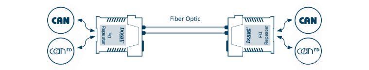 例如:在汽车生产及测试车间的设备,经常面临着高压高磁的环境,且共地的电机可能会产生非常大的电势差(相对于地面)。这种情况可以用IXXAT的CR 110/FO或者CR210/FO来将CAN信号转换为光纤信号。模块本身的电气隔离高于一般的设备,且传输形式采用光纤不仅能够保护后续设备,还能够抗强磁场带来的干扰。
