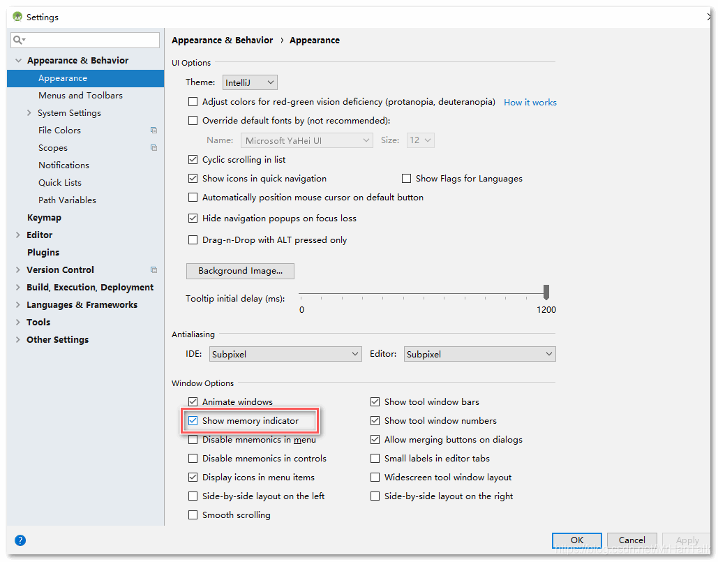 在 Settings -> Appearance 页里,打开 Show memory indicator 选项,然后主界面右下角会显示 Heap 总大小以及使用状况。这样操作一下,就可以确认 Heap Size 修改是否生效。