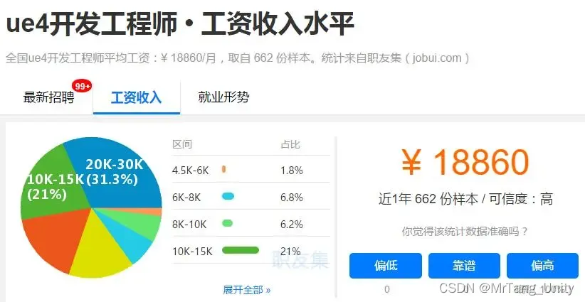 虽然Unity的人才需求要大于UE4,但是从全国范围内的平均薪资来看,UE4的平均薪资要高于Unity,主要原因如下: