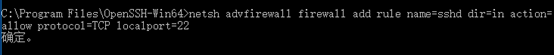 4、 步骤3成功后,继续如下的命令后回车: netsh advfirewall firewall add rule name=sshd dir=in action=allow protocol=TCP localport=22