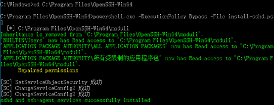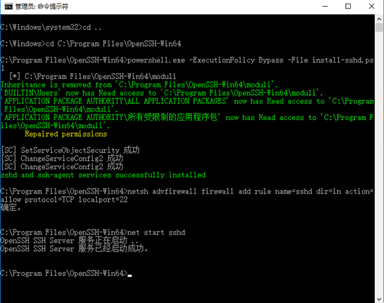 3、 运行命令提示符(管理员),使用cd命令到步骤3中文件夹OpenSSH的位置,然后输入命令后回车: powershell.exe -ExecutionPolicy Bypass -File install-sshd.ps1
