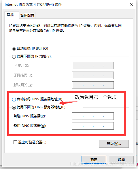 5) 将“DNS服务器地址”选项改为第一个,即为“自动获得DNS服务器地址“,一步步点击“确定”返回去,就OK啦。