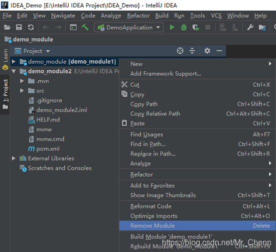 移除完成,可以看到在Project视图下,demo_module1已经不存在了。但是查看文件管理器可以看到,刚才remove的demo_module1对应的文件夹\demo_module依然存在。