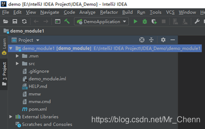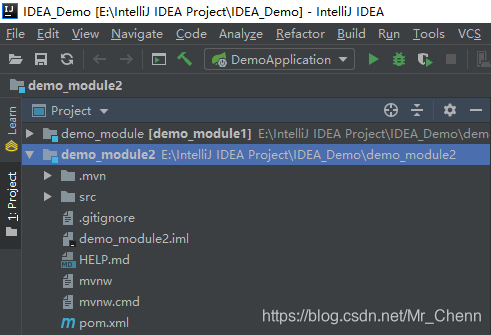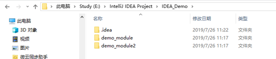配合文件管理器可以看到,原先的存放demo_module模块的文件夹名称修改成了demo_module1,但是里面存放的还是demo_module模块。在IDEA中,Project视图下,显示的左边是模块存放的路径,右边中括号内是模块的名称。