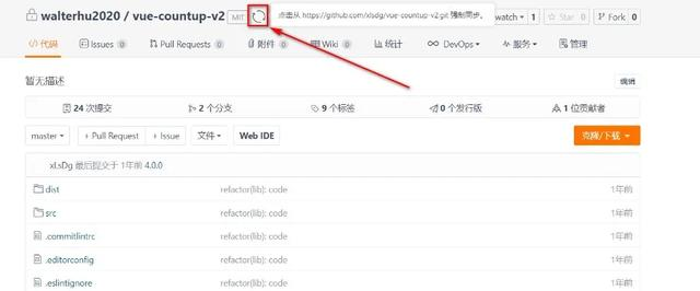 3.等待导入操作完成,然后在导入的仓库中下载浏览对应的该GitHub仓库代码,你也可以点击仓库顶部的“刷新”按钮进行Github代码仓库的同步。