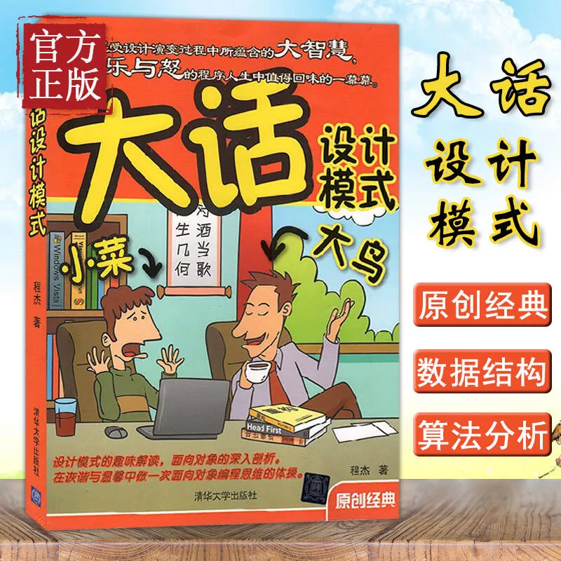 作者程杰,高级工程师,我第1次看到这个封面时,感觉像儿童读物似的,其内容的呈现也很像,采用的是情景对话模式,通过讲故事的方式来讲设计,内容方面无功无过,有时举例子有点牵强,主要的一点就在于对设计模式的讲解生动。作者有过教育经验,所以小菜对大鸟的提问会反映初学者会产生的疑问。对初学者来说是好的,值得推荐,有一点基础的就可以不看了,会感觉无聊。