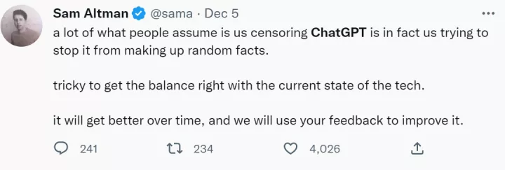 ChatGPT生成的答案有很高的错误率,对于这一问题,OpenAI CEO萨姆・阿尔特曼表示:「我们正在试图阻止 ChatGPT 随机编造,现阶段让其与当前技术保持平衡是很棘手的。随着时间的推移,我们会根据用户反馈来改进它,相信 ChatGPT 会变得更好。」