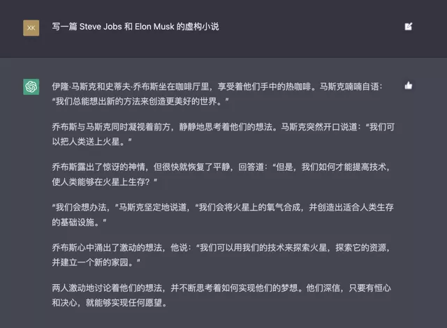 有人尝试让 ChatGPT 创作了一篇关于 Steve Jobs 和 Elon Musk 的虚构小说,看起来像模像样的。