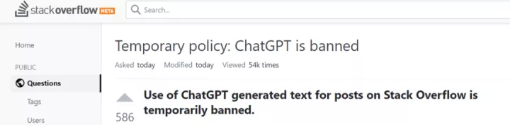 就在网友们对ChatGPT的沉迷与膜拜中,Stack Overflow 宣布暂时封禁 ChatGPT,因为它生成的答案正确率太低,发布由 ChatGPT 创建的答案对网站和查询正确答案的用户来说是非常有害的。
