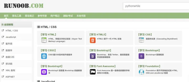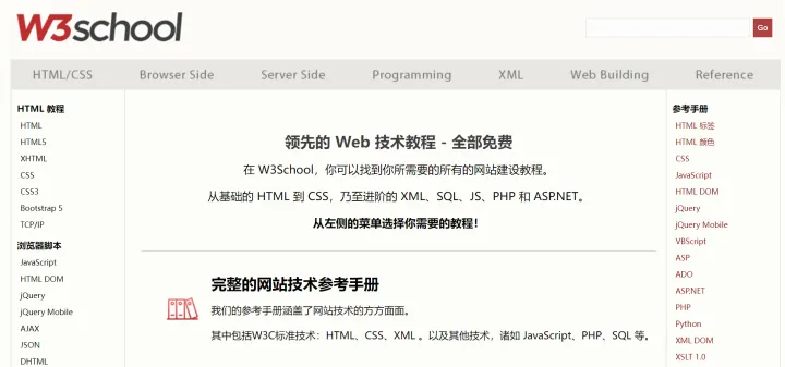 与菜鸟教程类似,涵盖从从基础的 HTML到CSS,乃至进阶的XML、SQL、 JS、 PHP 和 http://ASP.NET。不过个人认为,W3school的内容更丰富,而且还有微课这种模式,比较有意思。