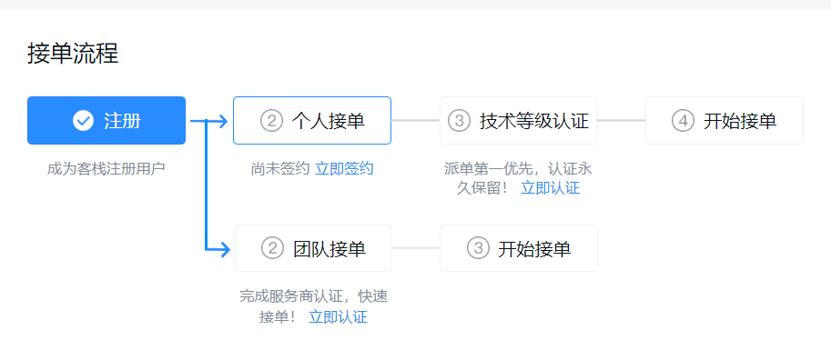 在程序员客栈你可以选择多样化的接单方式。如果你是一个团队,可以完成服务商认证,快速接单,如果作为个人只需进行技术认证,就可以开始接单。