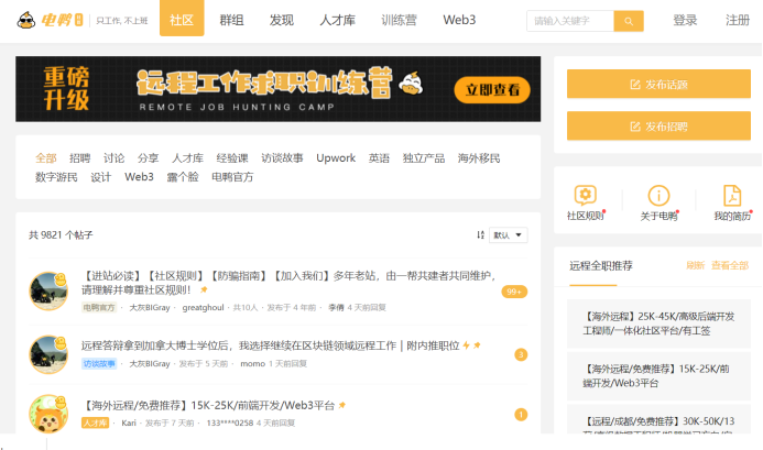 电鸭社区已经创立了8年+,是一个程序员的远程工作招聘社区。这里的论坛偏讨论性质,活人多,活跃用户多,可以直接和单主沟通交流,提高效率。缺点是大多数是一些小公司和初创公司。