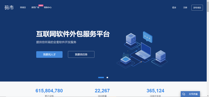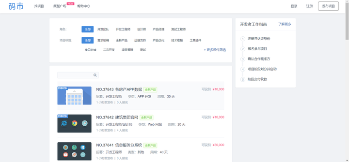 码市上的项目数量中等,但胜在接单流程简单清晰,项目可视化,还是比较推荐的。