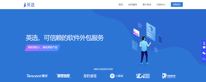 英选不同于传统外包,是采取了平台全程托管的方式。由平台分配开发者来完成相应的开发任务,项目进程中包含22个测试环节,程序员平均5年工作经验,并有8种规范交付物,保证项目透明和风险大幅降低。