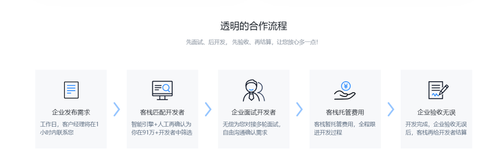91万+中高端开发者入驻的程序员集合地,有大量的面向开发者的兼职。在程序员客栈上的项目要通过企业发布需求-客栈匹配开发者-企业面试开发者-客栈托管费用-企业验收的步骤,环环流程保障了开发者和需求方的各项权益。