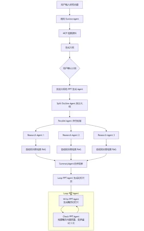 最初的核心逻辑是:用户输入一个主题,系统先检索大量资料生成大纲,再把大纲拆分成不同部分,自动生成多个并行的 agent,每个 agent 负责研究其中一部分,研究完汇总结果,最后再把汇总的内容写成 PPT。说白了就是总分总的结构:先有整体大纲,再分模块研究,最后汇总成完整的 PPT。