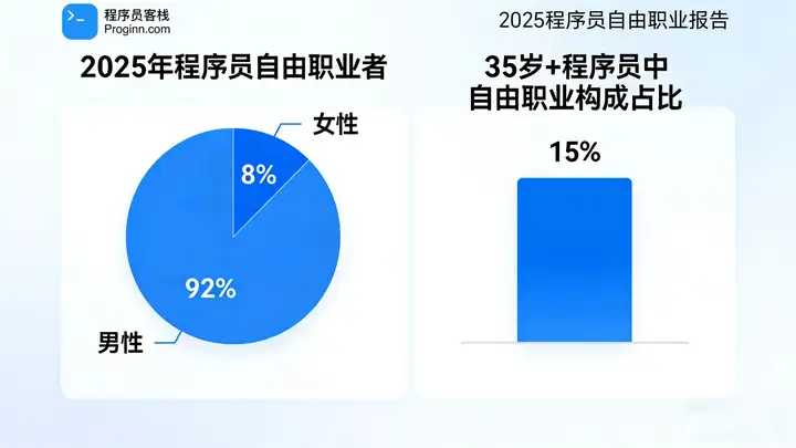 2020年的一场疫情如同一只突如其来的“黑天鹅”,许多人职业发展遭受重创,但也有人寻得契机,重调工作与生活的天平。只工作不上班,数字化转型加速,同时远程办公日趋常态化,2025年全球IT自由职业市场规模突破1.5万亿美元,年复合增长率超15%,中国程序员灵活就业群体同比增长22%。特别是在35岁职场焦虑下,有15%的35岁+程序员转向了自由职业。