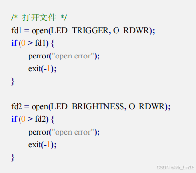 打开两个控制LED的属性文件,均使用可读可写的方式(fd1为触发模式 fd2为亮度设置)