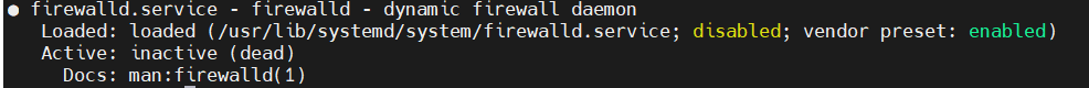 看到Active:后的状态为dead,证明防火墙已经处于关闭状态。且为disabled意为禁止开机启动。