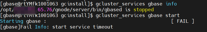 通过【gcluster_services gbase start】语句手动启动也失败,具体报错如下: