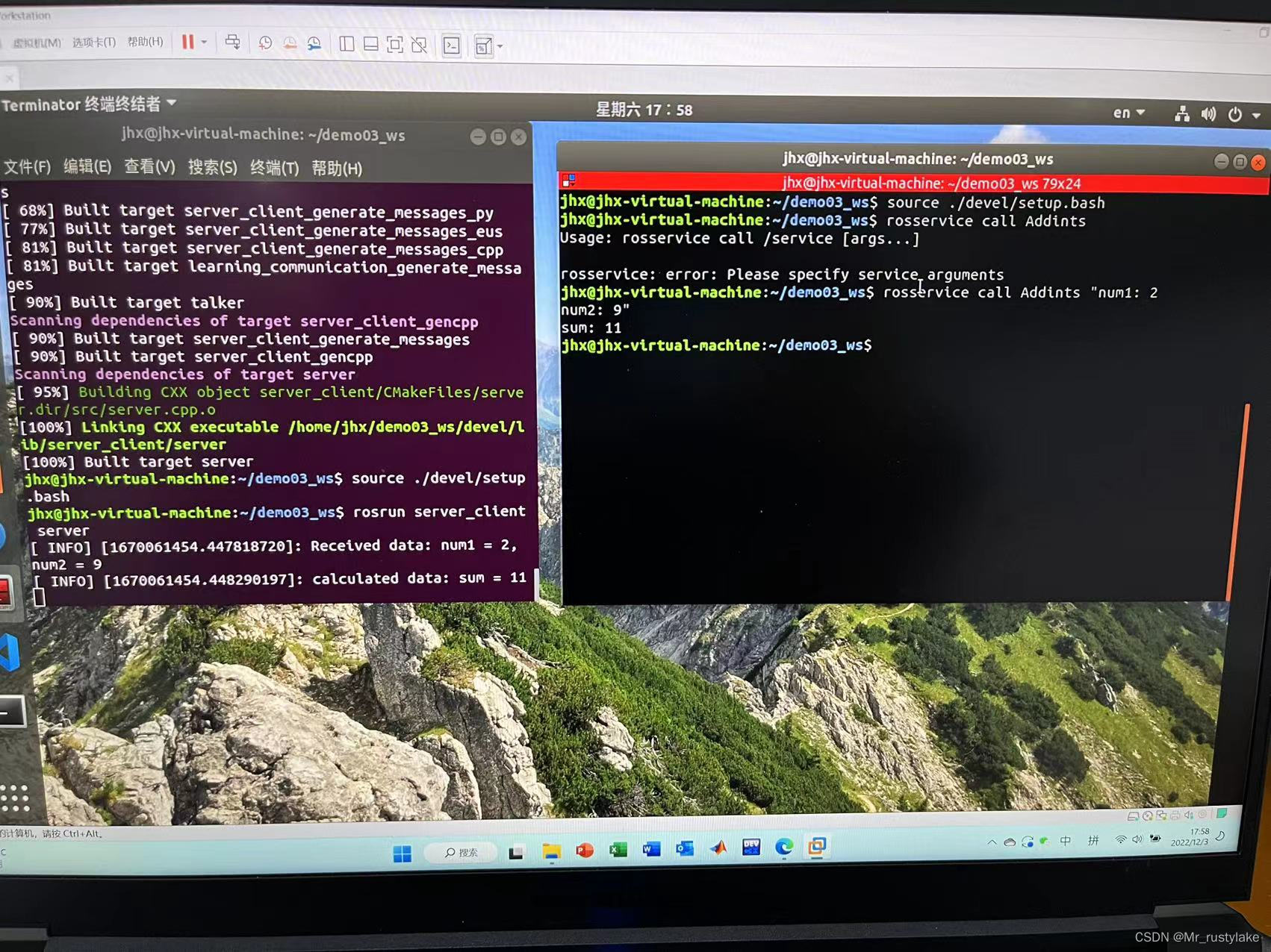 再开启一个终端,输入rosservice call Addints,敲击空格再使用tab键,再直接修改num1和num2的值,敲击回车,就能得到结果。