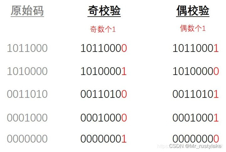 如0100101偶校验码就是10100101,当实际数据中“1”的个数为偶数的时候,这个校验位就是“0”,否则这个校验位就是“1”,这样就可以保证传送数据满足偶校验的要求。