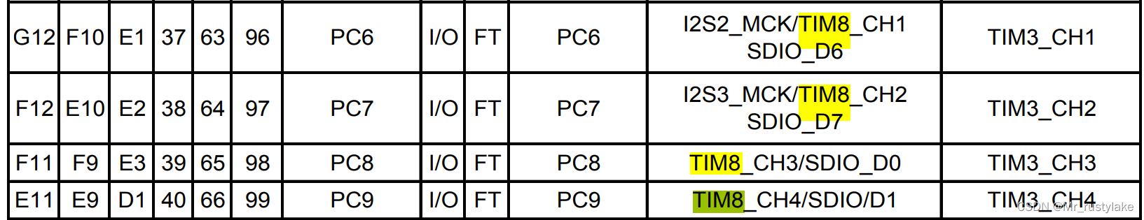 这里TIM8对应的4个通道的串口是PC6/7/8/9。
