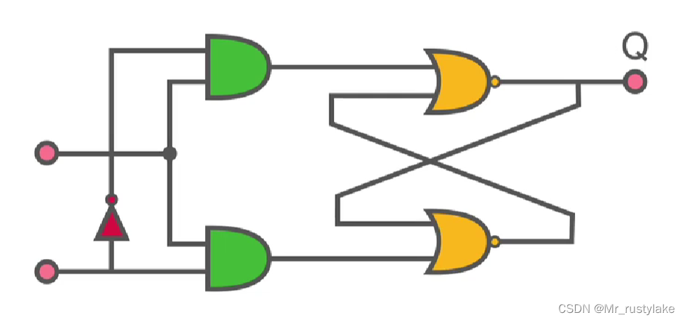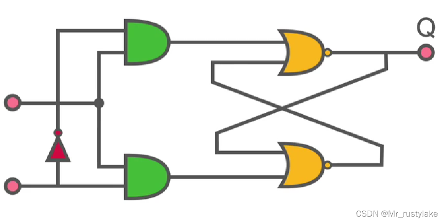 接下来介绍相关结构。首先介绍右侧的RS触发器,它由两个或非门组成,当R输入0,S输入1时,Q输出1;如果R输入1,S输入0,则Q输出0。当保持位输出0,则Q只能输出0,所以只有保持位为1的时候,后面的触发器才有效。所以如果我们需要储存高电平,则需要在保持位输入1,输入端也输入1,则直接输出1。由于没有电容,它的存储速度很快。