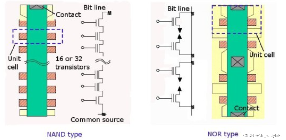 NOR FLASH将晶体管并联,每一位地址都可以被寻址;NAND FLASH将晶体管串联,这样连线更少,电路更简单,便于集成。