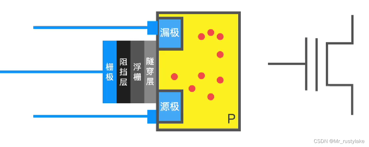 即闪存。其原理如图所示,当栅极给到高电平时,电子进入浮栅层,中间变成N性,但由于隧穿层的存在,电子无法返回,则无法回到N极。如果想要释放电子则在栅极施加负电压。由于这样的性质,闪存可以实现长期数据保存。