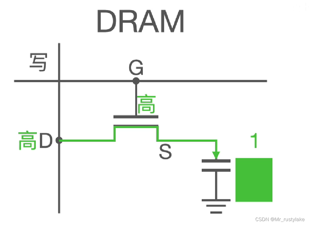 DRAM的存储原理和上面所说的FLASH类似,利用电容和晶体管。当栅极置于高电平时,我们存储高电位,给漏极输入高电压时,电容器被充能,有高电位;同样,如果想给存储低电平,则给漏极输入低电平,电容器的能量被释放,有低电位。读取时,则导通栅极,在漏极接入信号放大器,检查我们的输出信号。