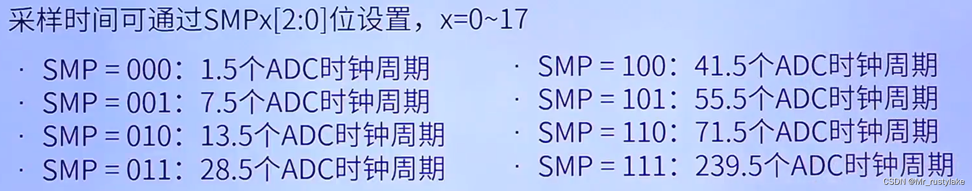 接下来确定转换时间。采样时间239.5个ADC时钟周期为例,可以得到转换时间为21us。