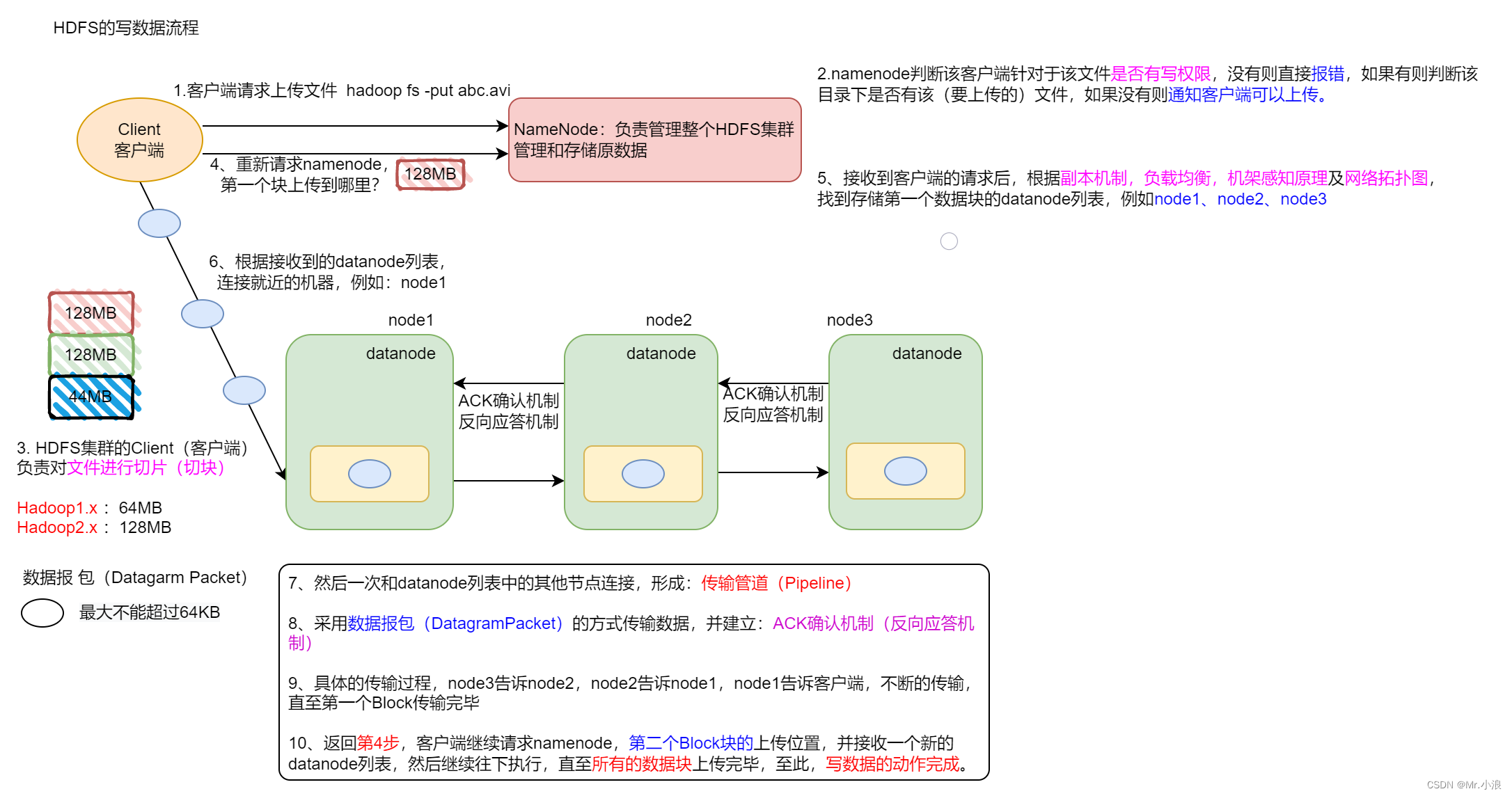 5、紧接着客户端接收到 DataNode 列表后与列表中的节点连接形成传输管道,再通过数据包(MAX=64KB) 的方式传输数据,并建立 ACK(方向应答机制)。