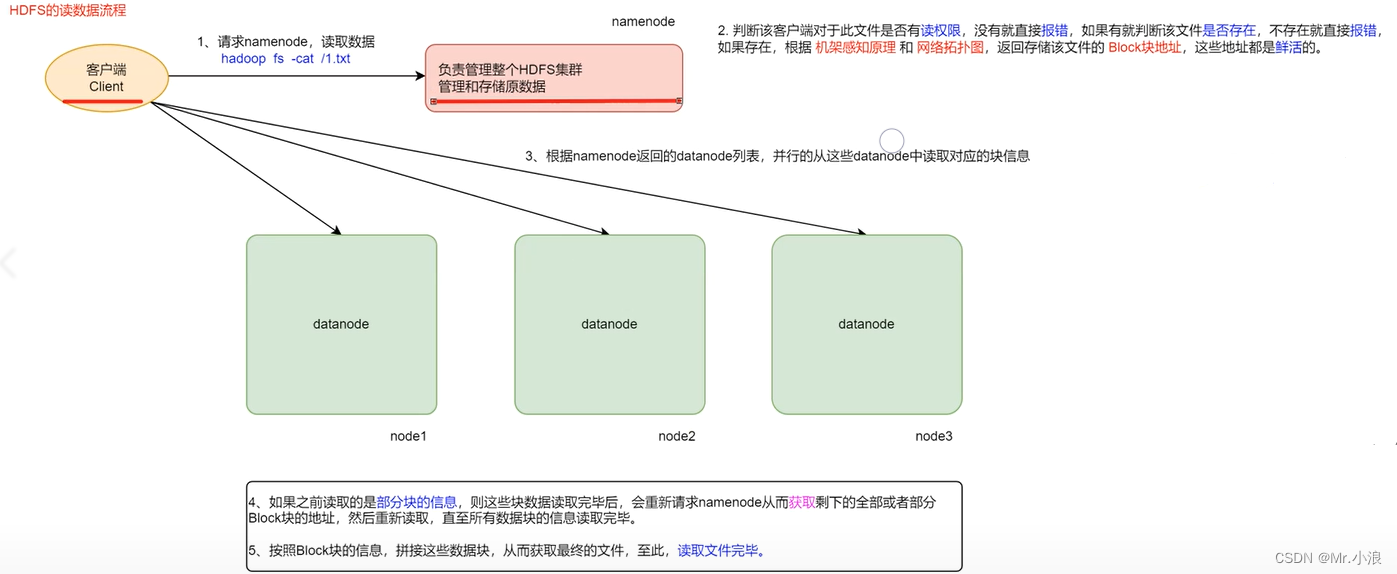 3、然后客户端根据地址读取存储在 DataNode 中 Block块 的信息。如果之前读取是部分 Block块 的信息,客户端会再次请求 NameNode 从而获取剩余 Block块 地址,重新读取,直到全部读取。最后按读取的 Block块 进行拼接,得到完整文件。
