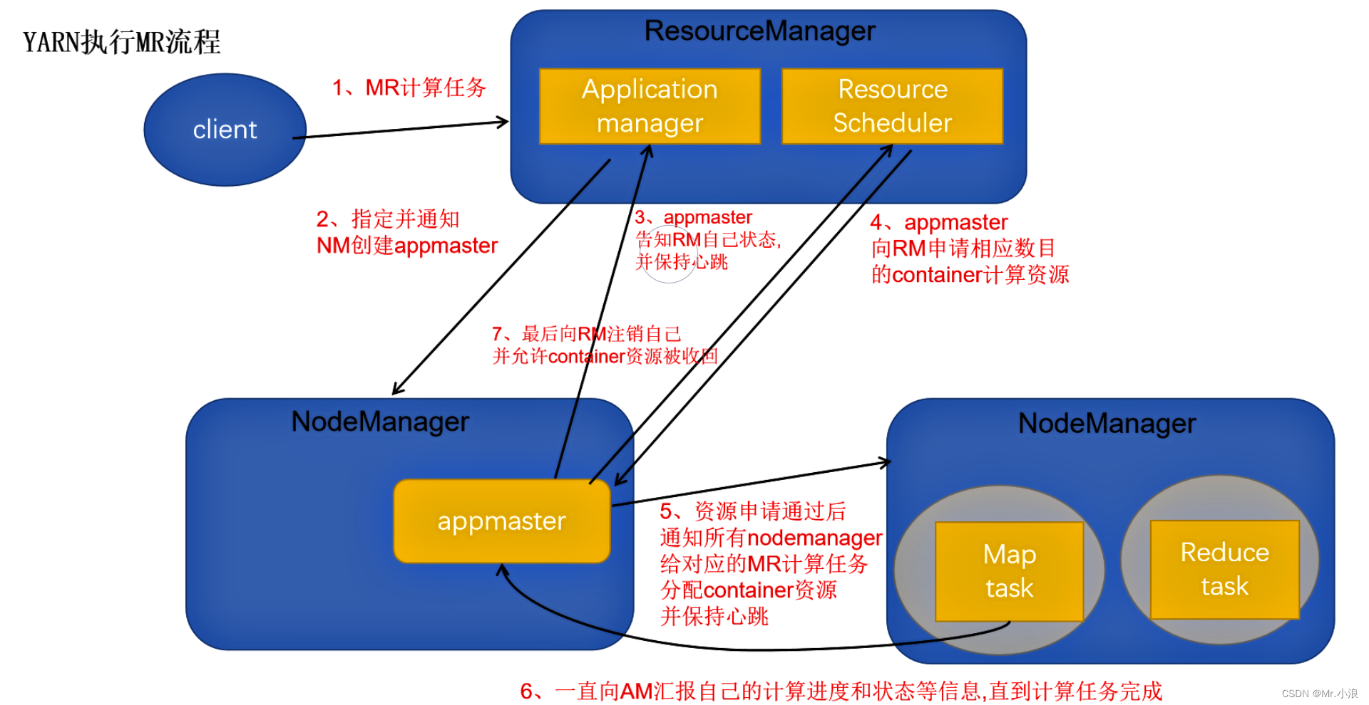 5、分配完资源开始计算,同时会一直向appmaster汇报自己的情况,直到计算完成。