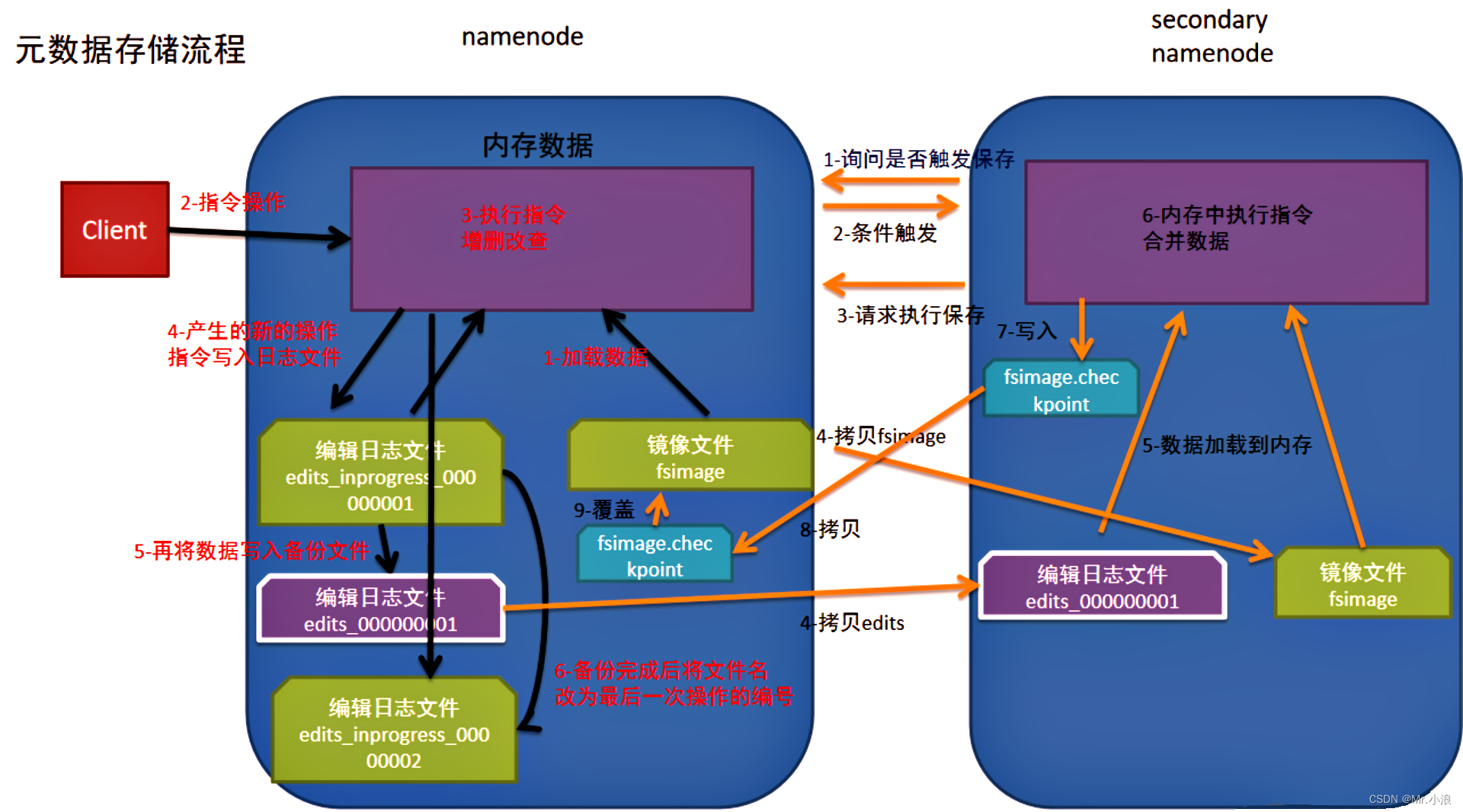 内存元数据 :NameNode 运行过程中产生的元数据会先保存在内存中,再保存到文件元数据中。