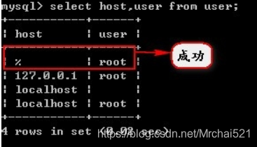 第六步:使用“select host,user from user;”查看修改是否成功。