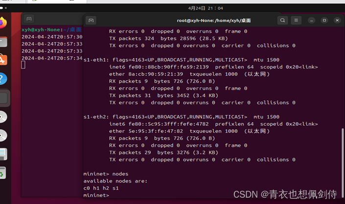 请注意,这些命令是在 Mininet 外部执行的,而不是在 Mininet 内部。这些命令的目标是配置宿主机上的网络接口和路由,以便 Mininet 内部可以通过宿主机的物理接口进行通信和监控。