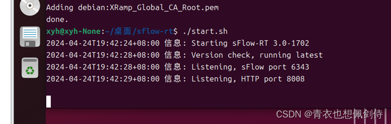 可以看到sFlow已经启动,默认端口为6343,可以通过虚拟机内置的浏览器输入http://localhost:8008打开监控页面