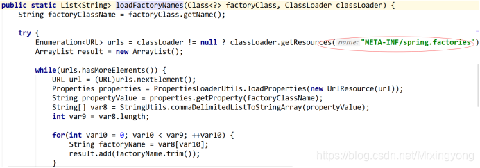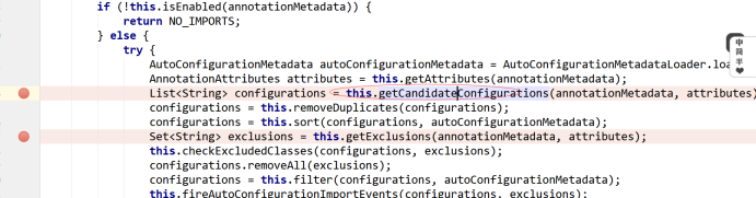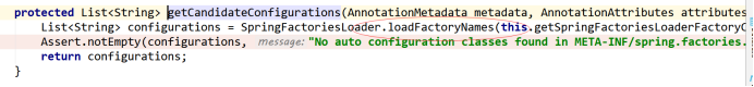 方法,我们注意到红色标记的方法 this.getCandidateConfigurations(annotationMetadata, attributes);点击进去看到