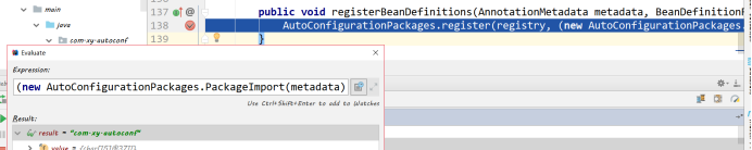 ,我们打一个断点在以下位置,看看注入了哪些类到容器,通过程序调试看到packageNames的结果为以下图中的result:com.xy.autoconf,该包即为主配置类所在的包,故我们可以得到SpringBoot会把主配置类所在的包极其子包下的类注入到Spring容器中。我们将自定义的JavaBean也要放到这个位置就能被Spring容器加载