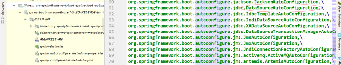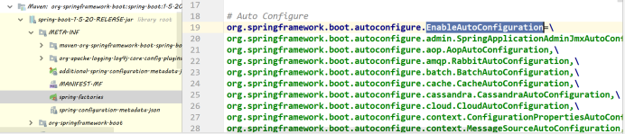 看到资源名字是类路径下面的META_INF/spring.factory文件,分析此段代码我们不难得出结论:SpringBoot会加载类路径下的META_INF/spring.factory文件并从中获取EnableAutoConfiguration指定的值作为组件注入到Spring容器。我们可以进入到依赖的一个jar,看到以下配置,该部分就是SpringBoot要自动注入到容器的JavaBean