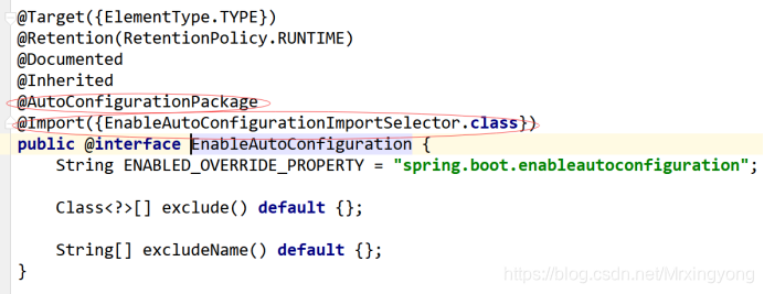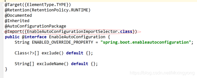 这又是一个组合注解,注意到@Import注解,该注解是Spring底层的一个注解,作用就是将JavaBean注入到Spring容器,既然是注入到容器,那我们就来看一下是注入了那些JavaBean到容器,点击进入EnableAutoConfigurationImportSelector(选择将哪些组件注入到容器的选择器)