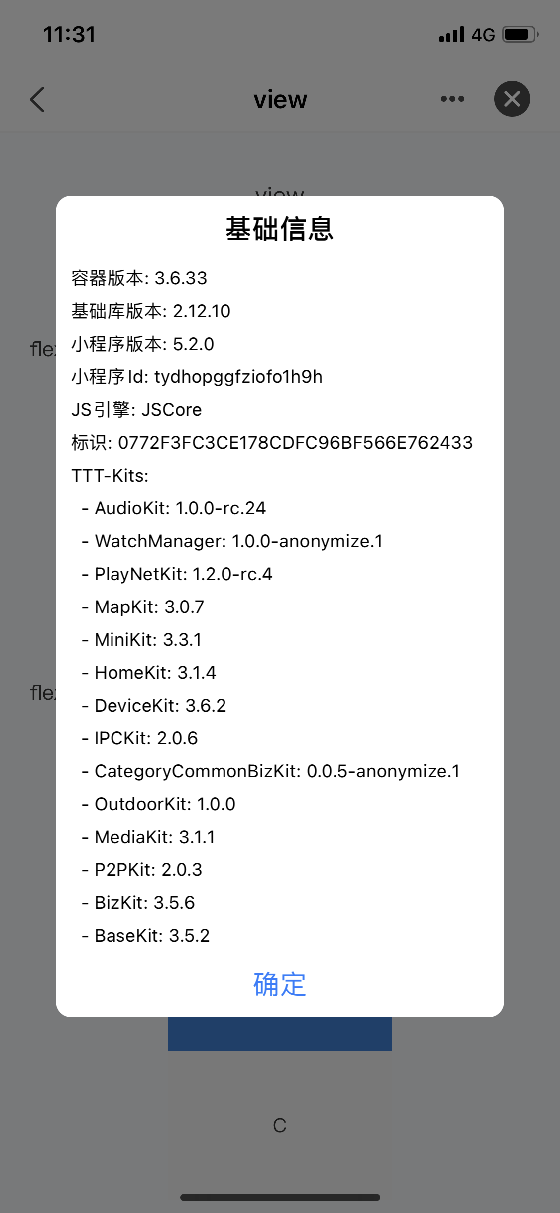 弹窗显示的就是 App 中调用的基础库版本以及集成的 Kit 版本。