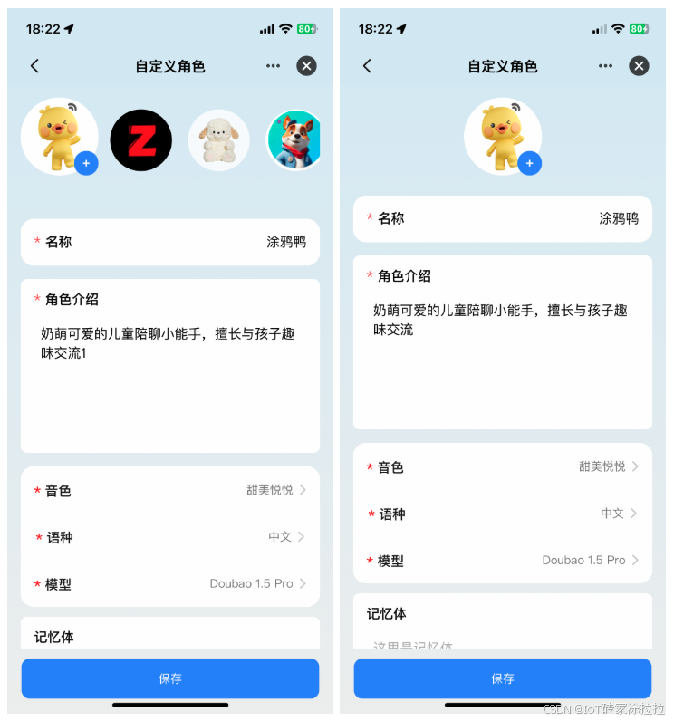 角色新增/编辑页面主要用于修改角色信息(头像、名称,角色介绍、记忆体),以及选择音色、语种、和大模型。