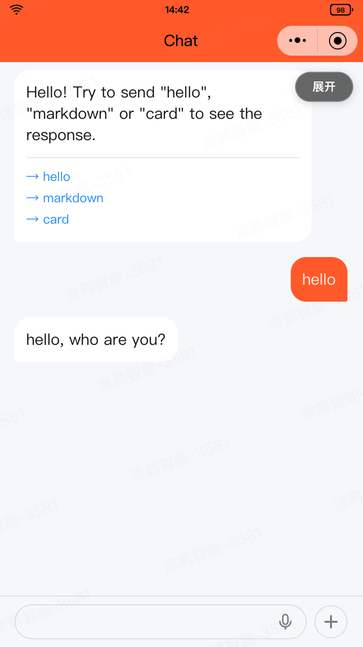 在开发状态下,可以使用 Mock 机制在 IDE 下进行模拟对话。新建一个文件,例如 src/pages/Home/mock.ts,用于模拟消息回复。