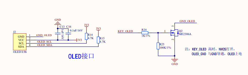 出于低功耗的考虑,我们还用 NMOS 管和电阻搭建了开关电路。当药盒待机时,“KEY_OLED” 引脚拉低,NMOS 管截止,“GND_OLED”与 GND 断开,OLED 屏断电。原理图: