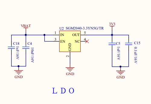 选型的时候,在满足性能需求的同时,尽可能的选取静态功耗低的芯片。本次选取的 LDO 型号为 SGM2040-3.3YN5G/TR,该芯片为固定输出 3.3V 电压的电压转化芯片,静态电流 $I_Q$ 仅为 1uA。 -