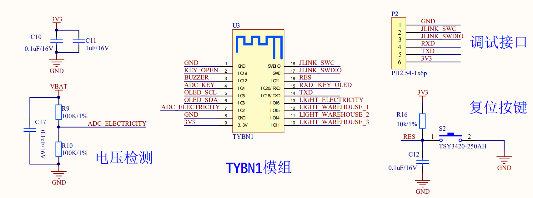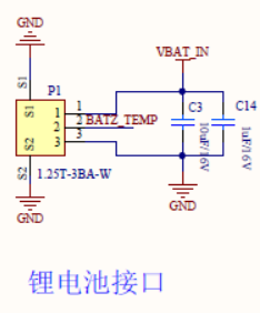 通过使用模组的 ADC 采样口对电池的电压进行采集,该 ADC 采集口 可允许输入的电压范围为 0~3.6V,由于电池电压(最高 4.2V)超出了该范围,故设计电阻分压,使其符合允许的输入电压范围。外围电路预留调试接口以及复位按键。
